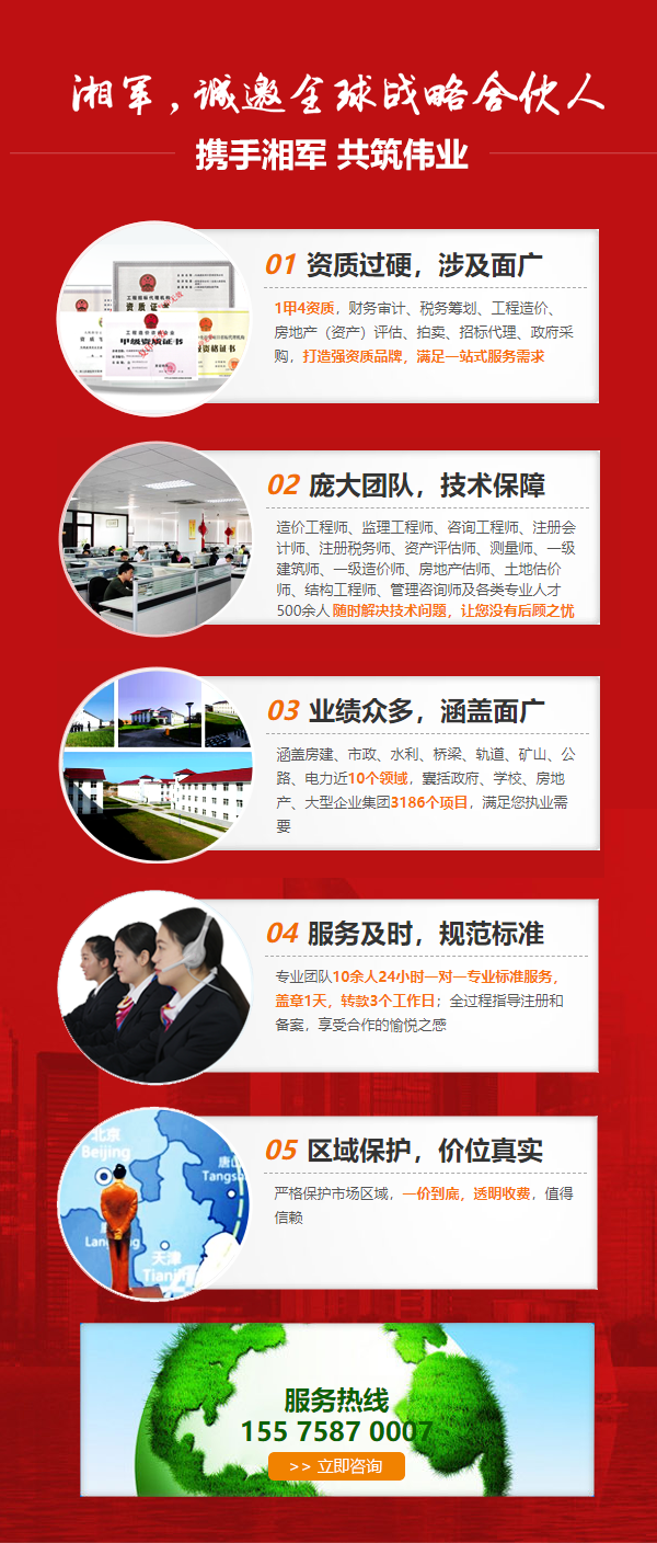 湖南湘軍咨詢集團有限公司創立于2008年,是湖南省目前最大的審計、評估、工程、經濟類綜合服務機構之一,形成了配套完善的工程項目服務、金融服務和財稅服務三大產品體系,具備項目決策、建設、運營、融資、管理咨詢、資本運作等一條龍服務功能。工程造價咨詢與工程監理等項目管理能力得到了各級政府的充分肯定,報表審計與房地產評估等金融服務產品在省內各金融機構通用,受到廣泛認同與支持。本集團為個人、企業、科技產業園、政府機構提供KPO(知識流程外包):驗資、審計、評估、工程造價、法律、融投資服務;BPO(業務流...